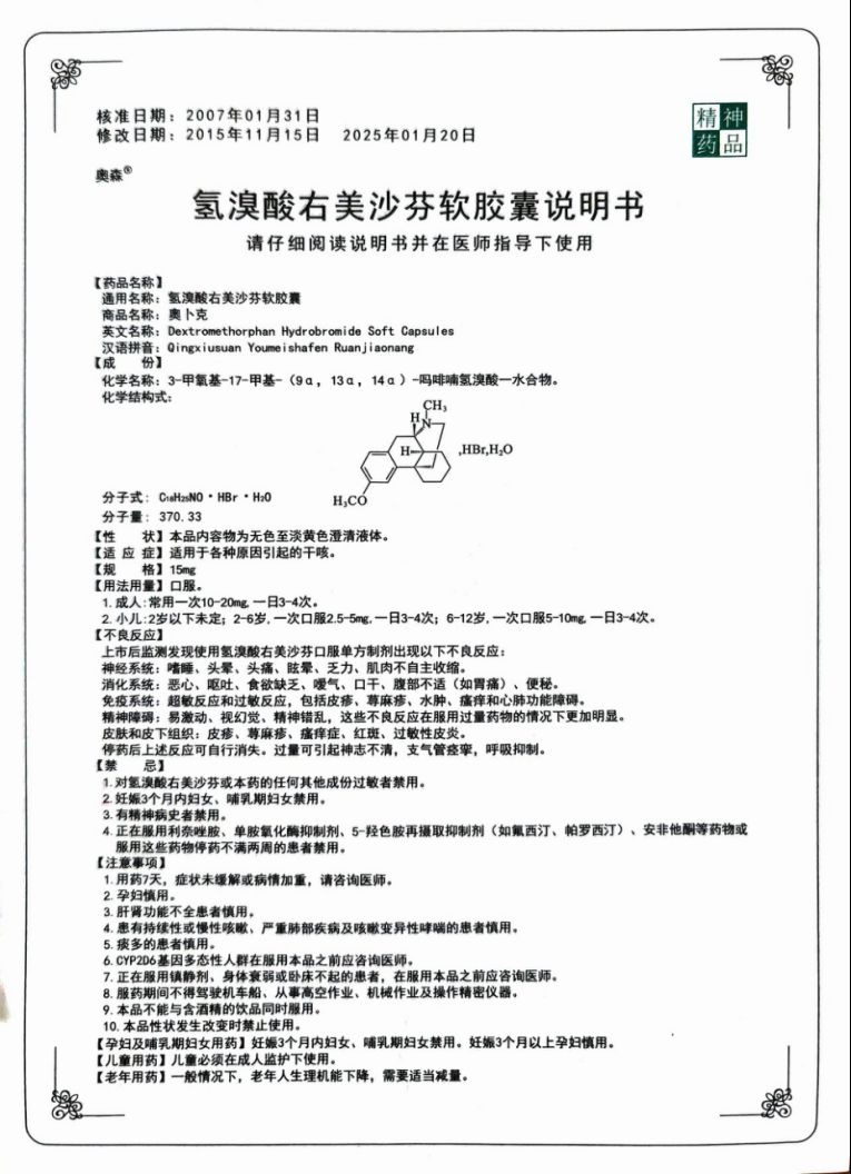 | 禁忌 | 1.對(duì)氫溴酸右美沙芬或本藥的任何其他成份過敏者禁用。2.妊娠3個(gè)月內(nèi)婦女、哺乳期婦女禁用。 3.有精神病史者禁用。 4.正在服用利奈唑胺、單胺氧化酶抑制劑、5-羥色胺再攝取抑制劑(如氣西汀、帕羅西。、安非他酮等藥物或 服用這些藥物停藥不滿兩周的患者禁用。 |