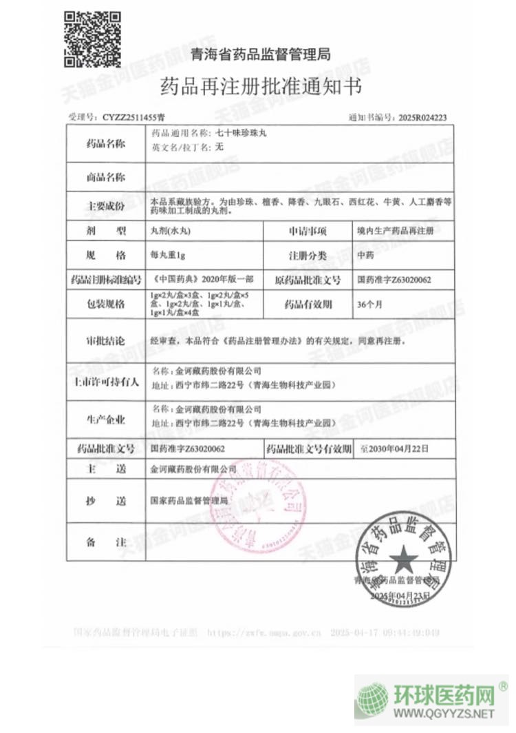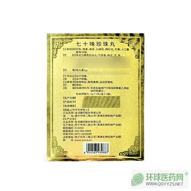 | 補(bǔ)充說明 | 產(chǎn)品參數(shù) 通 用名:七十味珍珠丸 成分:珍珠、檀香、降香、九眼石、西紅花、牛黃、人工麝香 等70味。 形狀:本品為黑色水丸;氣味香,味甘、澀、苦。 有效期:36個月 規(guī)格:1g×2丸×3盒 |