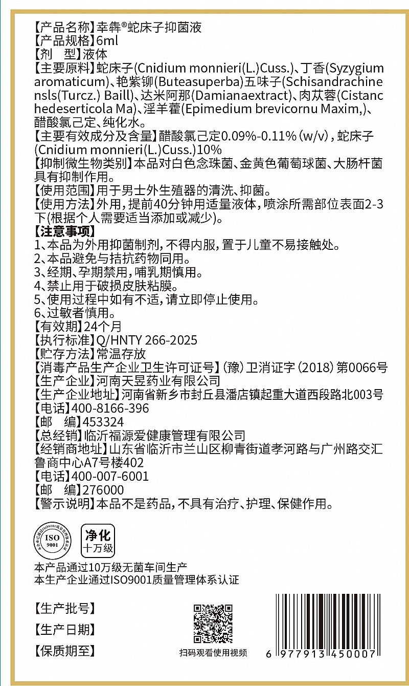 | 主要成分 | 蛇床子(Cnidiummonnieri(L.)Cuss.)、丁香(Syzygiumaromaticum)、艷紫鉚(Buteasuperba)五味子(Schisandrachinensls(Turcz.)Baill)、達米阿那(Damianaextract)、肉蓯蓉(CistanchedeserticolaMa)、淫羊藿(EpimediumbrevicornuMaxim,)、醋酸氯己定、純化水。 |