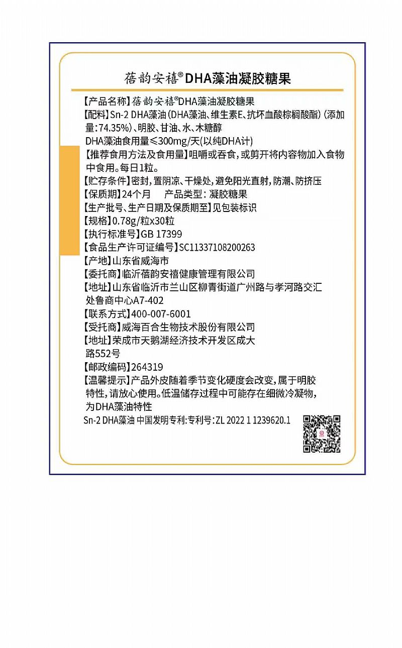 | 主要成分 | Sn-2DHA藻油(DHA藻油、維生素E、抗壞血酸棕櫚酸酯)(添加量:74.35%)、明膠、甘油、水、木糖醇DHA藻油食用量≤300mg/天(以純DHA計) |