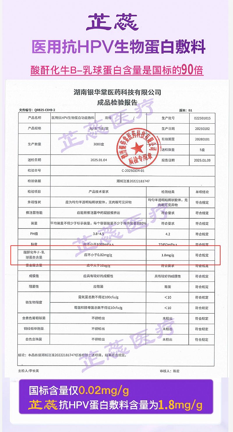 | 補充說明 | ★ 芷蕊醫(yī)用抗HPV生物蛋白敷料,是國家藥監(jiān)局官網(wǎng)可查(湘械注準(zhǔn)20222181747),械字號醫(yī)用抗病毒敷料,是升級版蛋白敷料,雙抗hpv成分:酸酐化牛β-乳球蛋白、β-葡聚糖,輔以卡波姆,效果更強! ◆核心成分乳球蛋白通過正負(fù)電荷相吸改變HPV結(jié)構(gòu)來滅活病毒、阻斷感染,葡聚糖通過提高局部免疫細胞活性,來清除漏網(wǎng)的HPV,外攻內(nèi)抗,效果才好,然后卡波姆把滅活HPV包裹排出體外。 ◆更主要的是芷蕊用的金*同款乳球蛋白,而且蛋白含量超充足,達到1.8mg/g。 ★所以芷蕊是升級版蛋白敷料,不僅有多支部隊跟病毒作戰(zhàn),而且主力部分兵多將廣,戰(zhàn)斗力超強所以抗病毒效果好。尤其是對高危亞型更是它的強項,病毒滯留性強、頭號難轉(zhuǎn)陰的HPV16、HPV18的滅活率都達到99%以上。 |