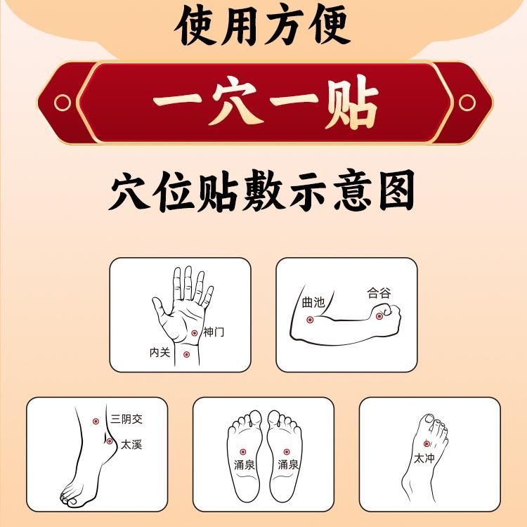 | 使用方法 | 高血壓穴位磁療貼使用方法:使用前請清潔貼敷部位皮膚,沿缺口處撕開密封包裝袋,取出產品,揭去離型紙,將貼片對準穴位(穴位請參照穴位圖,如不能精準取穴,請在醫(yī)護人員指導下使用),每貼使用6-12小時。建議貼敷部位為曲池、合谷、太沖、三陰交、涌泉。 |