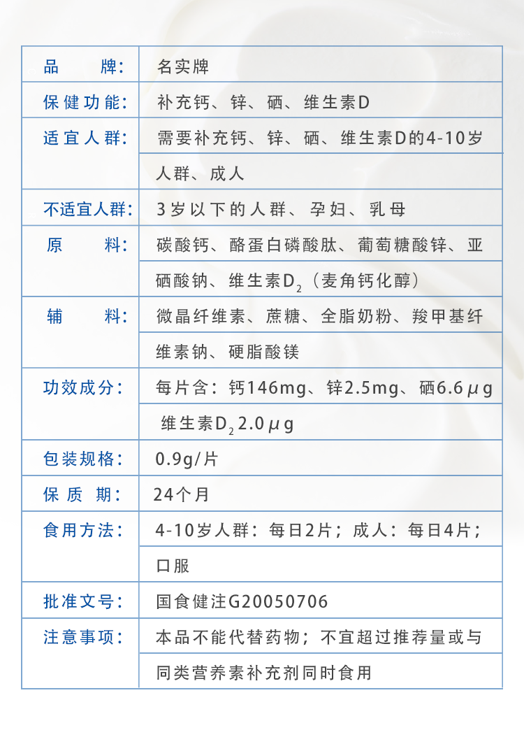 | 主要成分 | 碳酸鈣、酪蛋白磷酸肽、葡萄糖酸鋅、亞硒酸鈉、維生素D,(麥角鈣化醇)、微晶纖維素、蔗糖、全脂奶粉、羧甲基纖維素鈉、硬脂酸鎂 |