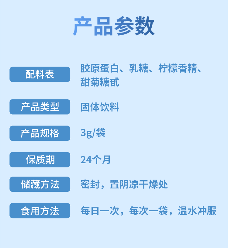 | 主要成分 | 膠原蛋白、乳糖,檸檬香精、甜菊糖苷 |