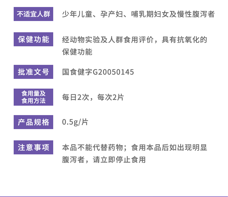 | 補(bǔ)充說明 | 注意事項(xiàng):本品不能代替藥物;食用本品后如出現(xiàn)明顯腹瀉者,請立即停止食用 不適宜人群:少年兒童、孕產(chǎn)婦、哺乳期婦女及慢性腹瀉者 |