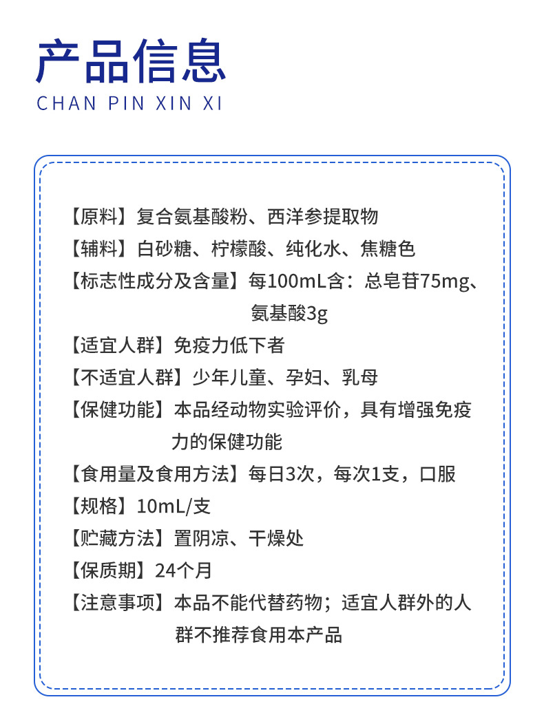 | 主要成分 | [原料]復(fù)合氨基酸粉、西洋參提取物 [輔料]白砂糖、檸檬酸、純化水、焦糖色 |