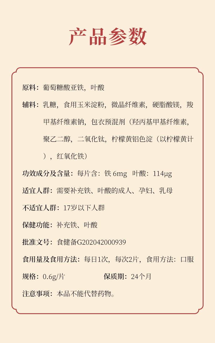 | 補充說明 | 保質(zhì)期:24個月 注意事項:本品不能代替藥物。 適宜人群:需要補充鐵、葉酸的成人、孕婦、乳母 不適宜人群:17歲以下人群 |