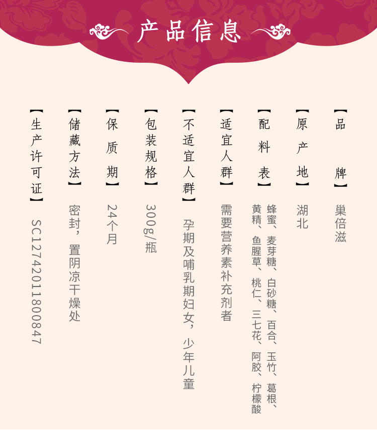 | 主要成分 | 蜂蜜、麥芽糖、白砂糖、百合、玉竹、葛根、黃精、魚腥草、桃仁、三七花、阿膠、檸檬酸 |