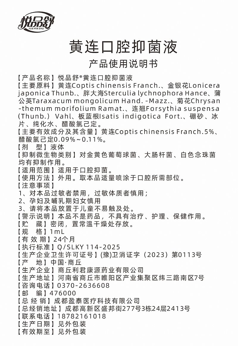 | 品牌名稱 | 悅品舒黃連口腔抑菌液 |