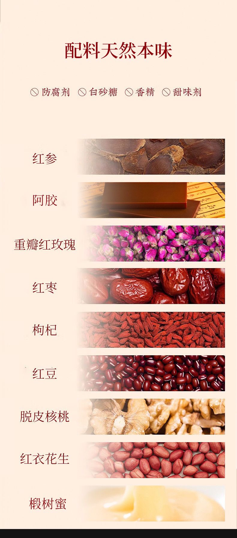 | 主要成分 | 紅參、阿膠、紅棗、紅豆、核桃等 |