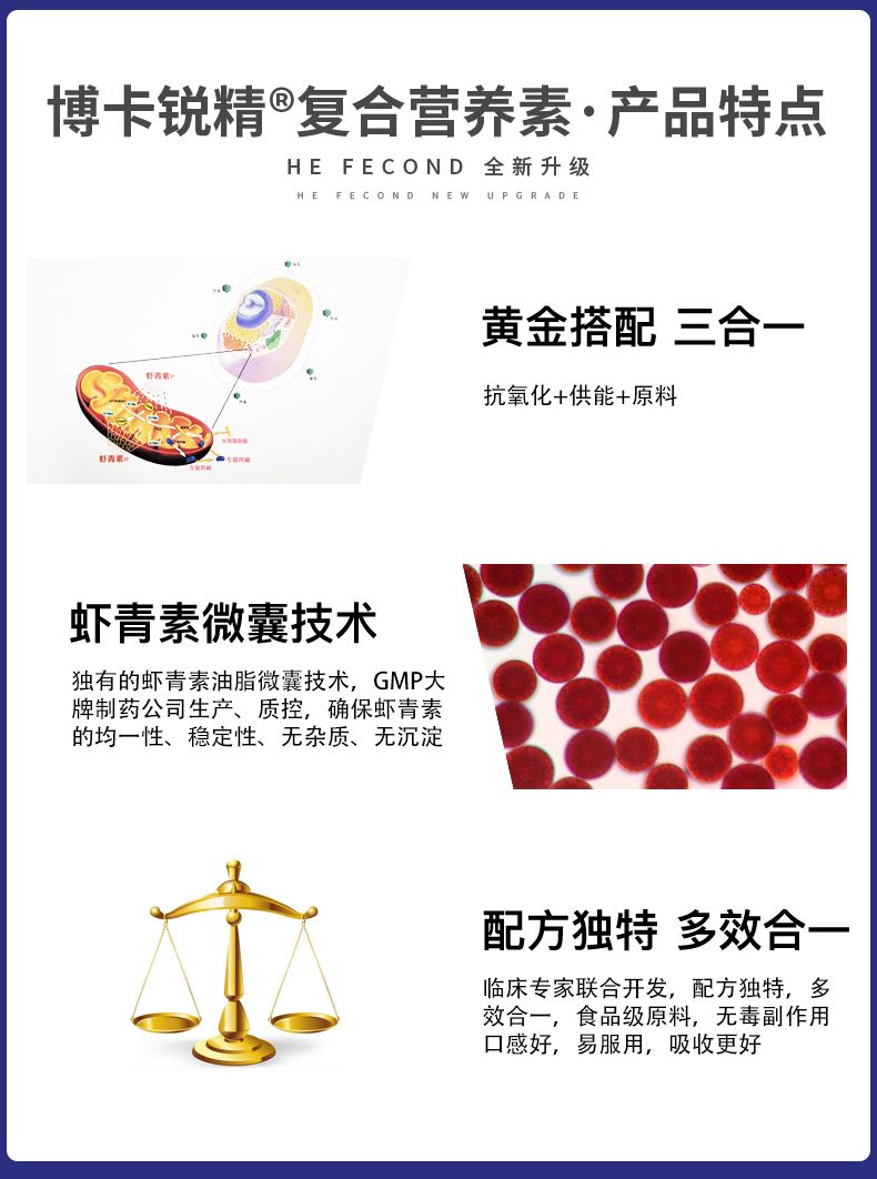 | 主要成分 | 蝦青素、左旋肉堿、葉酸、鋅、硒、L-精氨酸、牛磺酸、維生素C、維生素E、維生素B1、維生素B2、維生素B12 |