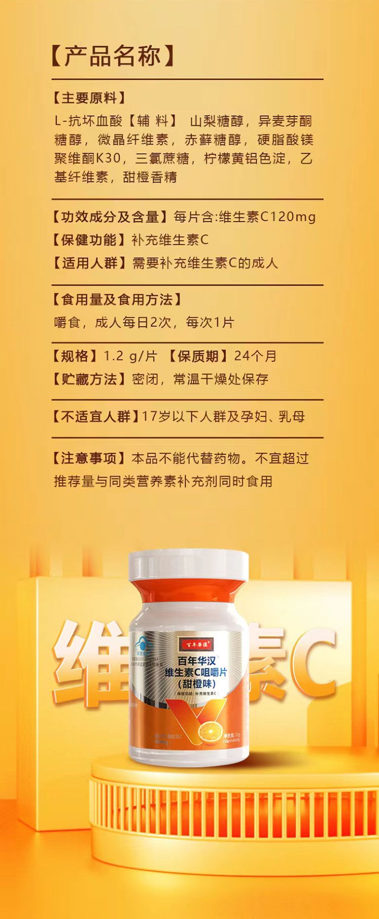 | 產(chǎn)品名稱 | 百年華漢維生素C咀嚼片 |